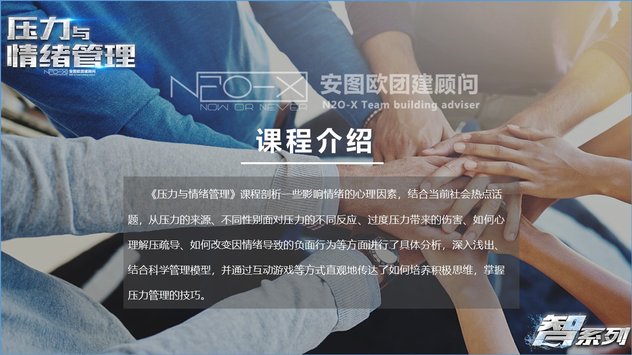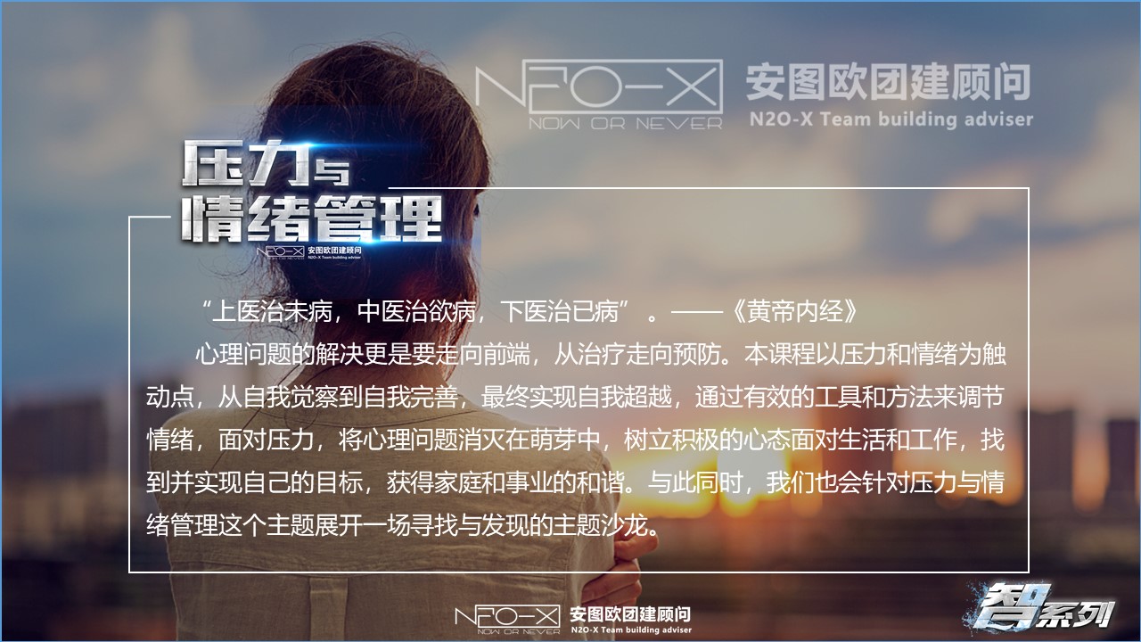 心理問題的解決更是要走向前端,從治療走向預(yù)防。本課程以壓力和情緒為觸動點,從自我覺察到自我完善,最終實現(xiàn)自我超越,通過有效的工具和方法來調(diào)節(jié)情緒,面對壓力,將心理問題消滅在萌芽中,樹立積極的心態(tài)面對生活和工作,找到并實現(xiàn)自己的目標(biāo),獲得家庭和事業(yè)的和諧。與此同時,我們也會針對壓力與情緒管理這個主題展開一場尋找與發(fā)現(xiàn)的主題沙龍。