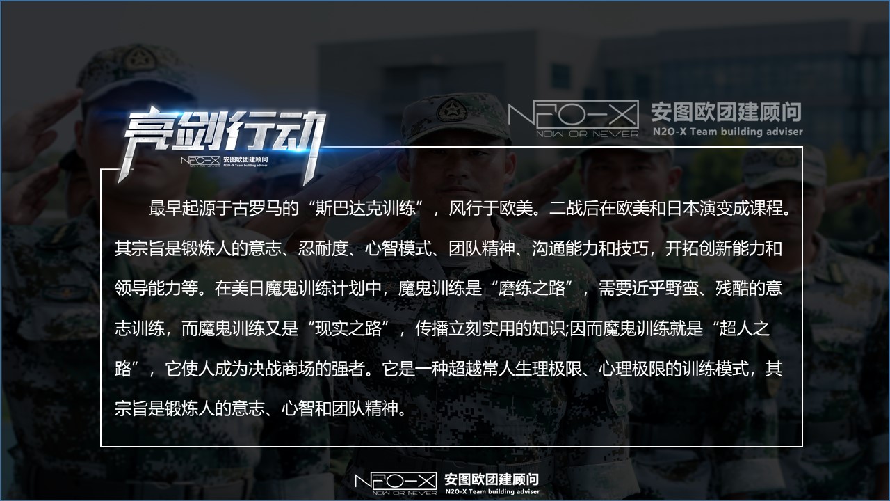 最早起源于古羅馬的“斯巴達(dá)克訓(xùn)練”,風(fēng)行于歐美。二戰(zhàn)后在歐美和日本演變成課程。其宗旨是鍛煉人的意志、忍耐度、心智模式、團(tuán)隊(duì)精神、溝通能力和技巧,開(kāi)拓創(chuàng)新能力和領(lǐng)導(dǎo)能力等。在美日魔鬼訓(xùn)練計(jì)劃中,魔鬼訓(xùn)練是“磨練之路”,需要近乎野蠻、殘酷的意志訓(xùn)練,而魔鬼訓(xùn)練又是“現(xiàn)實(shí)之路”,傳播立刻實(shí)用的知識(shí);因而魔鬼訓(xùn)練就是“超人之路”,它使人成為決戰(zhàn)商場(chǎng)的強(qiáng)者。它是一種超越常人生理極限、心理極限的訓(xùn)練模式,其宗旨是鍛煉人的意志、心智和團(tuán)隊(duì)精神。