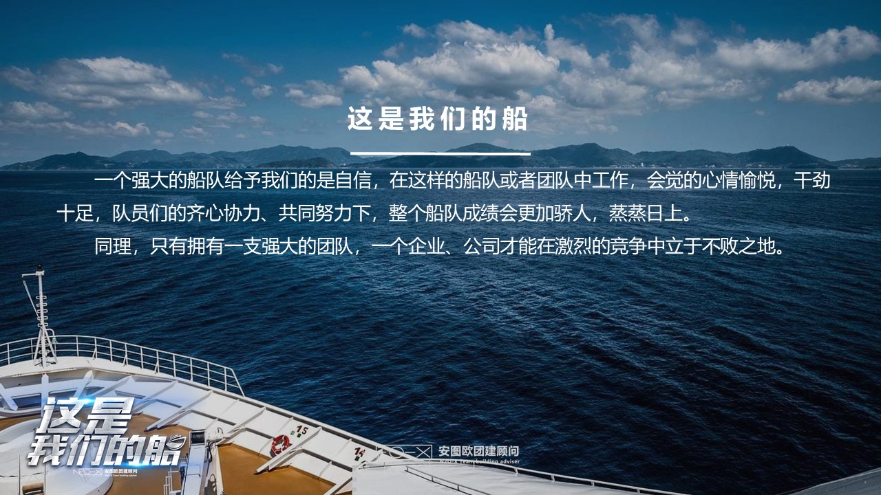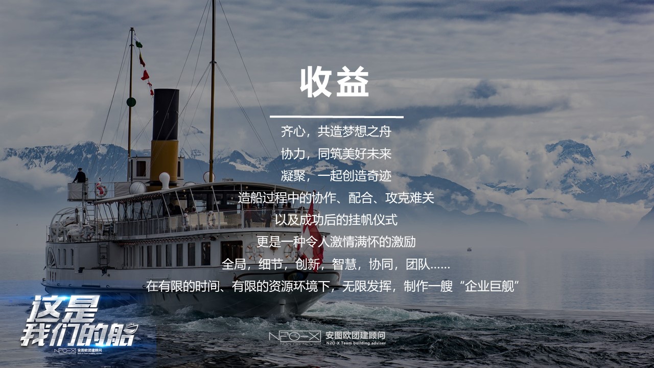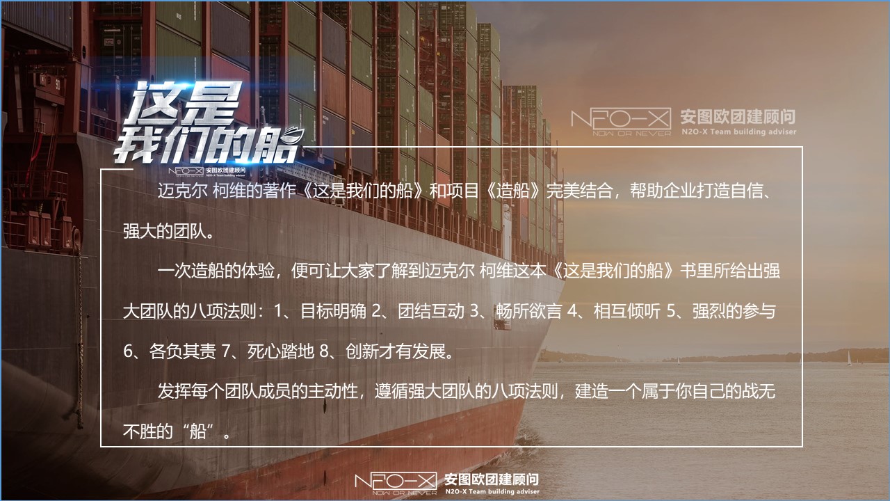 一次造船的體驗,便可讓大家了解到邁克爾 柯維這本《這是我們的船》書里所給出強大團(tuán)隊的八項法則:1、目標(biāo)明確 2、團(tuán)結(jié)互動 3、暢所欲言 4、相互傾聽 5、強烈的參與 6、各負(fù)其責(zé) 7、死心踏地 8、創(chuàng)新才有發(fā)展。