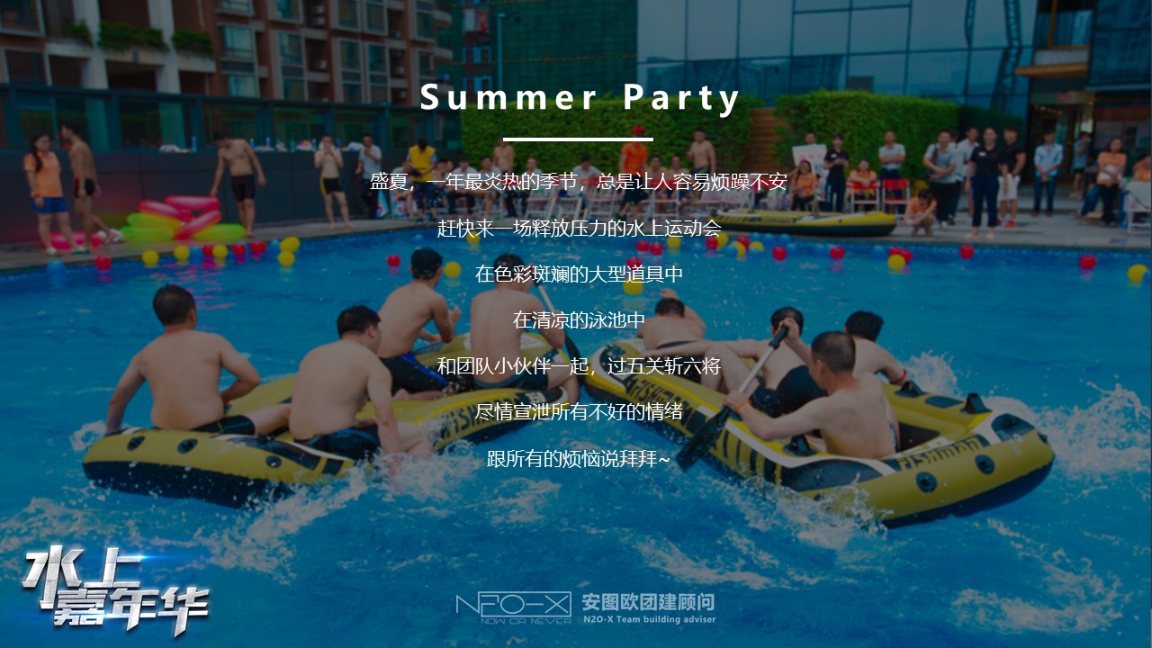 激情夏日,與伙伴們暢玩水上party。享受團(tuán)隊(duì)的凝聚,享受每一次的歡笑與落水的快感,每一個(gè)挑戰(zhàn)都需要團(tuán)隊(duì)齊心協(xié)力。激情與智慧的結(jié)合,盡情釋放內(nèi)心的小野獸,清涼夏日,等你來(lái)放肆。