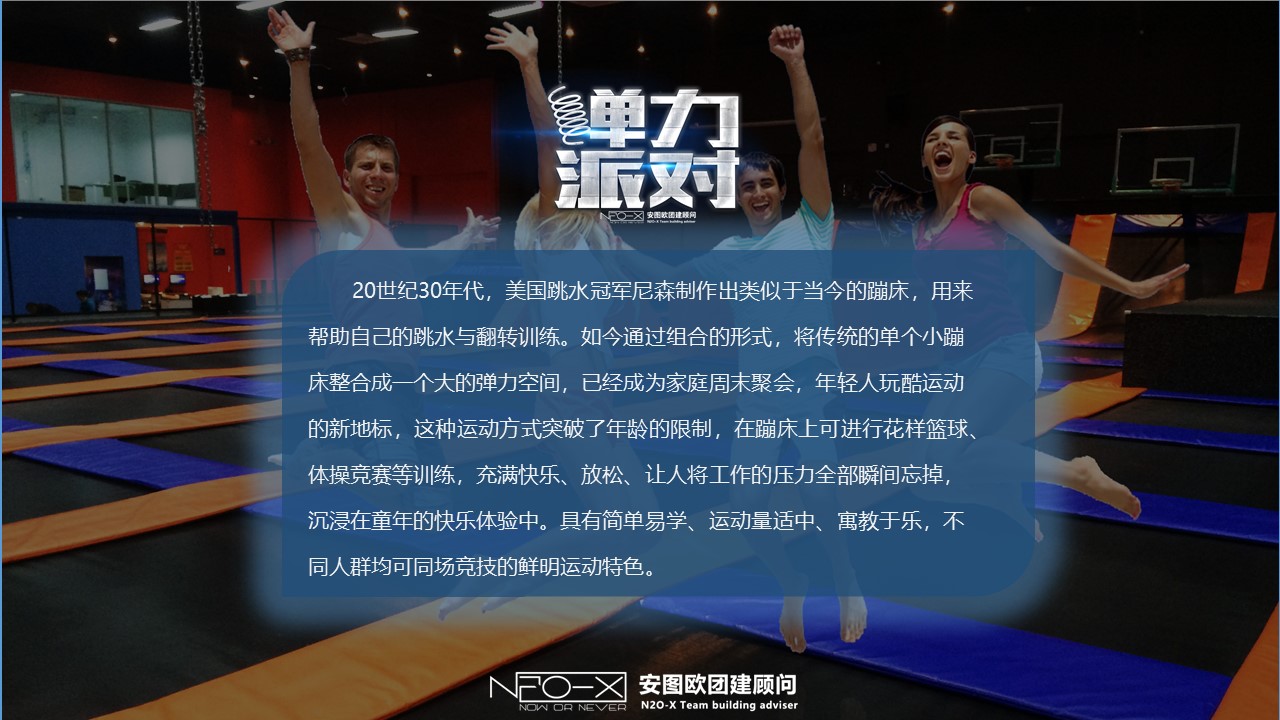 20世紀(jì)30年代,美國跳水冠軍尼森制作出類似于當(dāng)今的蹦床,用來幫助自己的跳水與翻轉(zhuǎn)訓(xùn)練。如今通過組合的形式,將傳統(tǒng)的單個(gè)小蹦床整合成一個(gè)大的彈力空間,已經(jīng)成為家庭周末聚會(huì),年輕人玩酷運(yùn)動(dòng)的新地標(biāo),這種運(yùn)動(dòng)方式突破了年齡的限制,在蹦床上可進(jìn)行花樣籃球、體操競(jìng)賽等訓(xùn)練,充滿快樂、放松、讓人將工作的壓力全部瞬間忘掉,沉浸在童年的快樂體驗(yàn)中。具有簡(jiǎn)單易學(xué)、運(yùn)動(dòng)量適中、寓教于樂,不同人群均可同場(chǎng)競(jìng)技的鮮明運(yùn)動(dòng)特色。