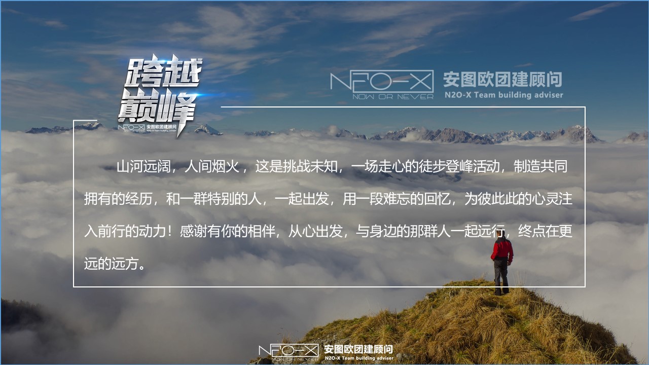 山河遠(yuǎn)闊,人間煙火 ,這是挑戰(zhàn)未知,一場(chǎng)走心的徒步登峰活動(dòng),制造共同擁有的經(jīng)歷,和一群特別的人,一起出發(fā),用一段難忘的回憶,為彼此此的心靈注入前行的動(dòng)力!感謝有你的相伴,從心出發(fā),與身邊的那群人一起遠(yuǎn)行,終點(diǎn)在更遠(yuǎn)的遠(yuǎn)方。