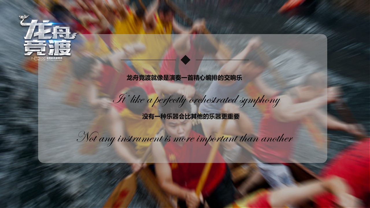 一場酣暢淋漓的龍舟賽的全過程可以影射出一個企業(yè)前進與拼搏的過程。一個成功的企業(yè)需要“掌舵者”及“槳手”的共同努力與合作,進而才能達到共享、共進、共贏的企業(yè)愿景!努力,拼搏,齊心合力,讓我們一起劃動船槳,沖向目標(biāo)。