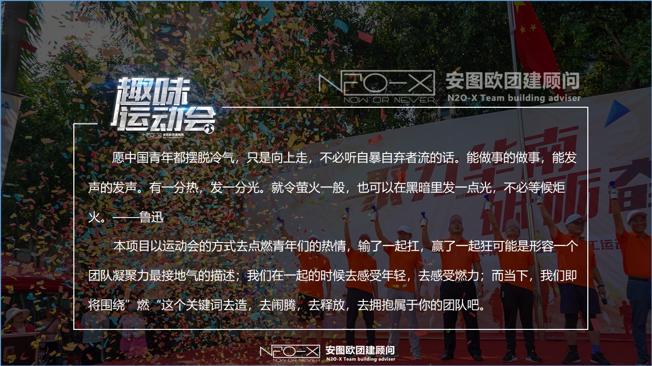 本項目以運動會的方式去點燃青年們的熱情,輸了一起扛,贏了一起狂可能是形容一個團(tuán)隊凝聚力最接地氣的描述;我們在一起的時候去感受年輕,去感受燃力;而當(dāng)下,我們即將圍繞”燃“這個關(guān)鍵詞去造,去鬧騰,去釋放,去擁抱屬于你的團(tuán)隊吧。