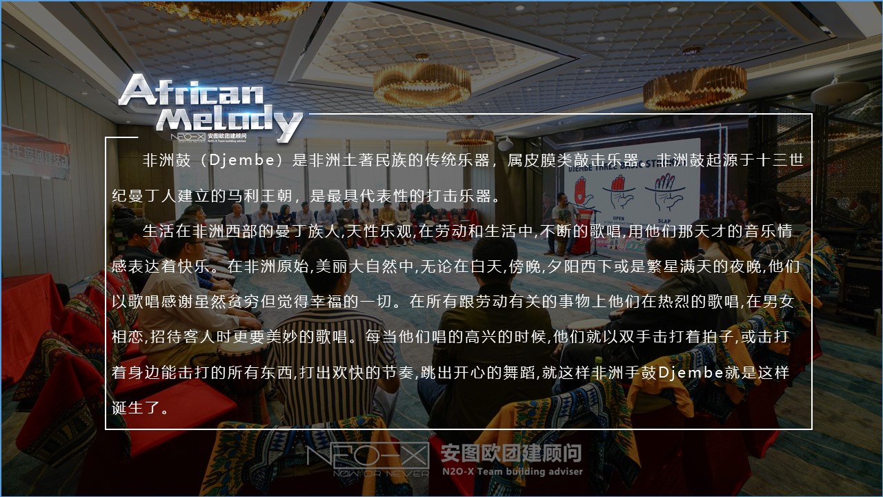 生活在非洲西部的曼丁族人,天性樂觀,在勞動(dòng)和生活中,不斷的歌唱,用他們那天才的音樂情感表達(dá)著快樂。在非洲原始,美麗大自然中,無論在白天,傍晚,夕陽西下或是繁星滿天的夜晚,他們以歌唱感謝雖然貧窮但覺得幸福的一切。在所有跟勞動(dòng)有關(guān)的事物上他們?cè)跓崃业母璩?在男女相戀,招待客人時(shí)更要美妙的歌唱。每當(dāng)他們唱的高興的時(shí)候,他們就以雙手擊打著拍子,或擊打著身邊能擊打的所有東西,打出歡快的節(jié)奏,跳出開心的舞蹈,就這樣非洲手鼓Djembe就是這樣誕生了。