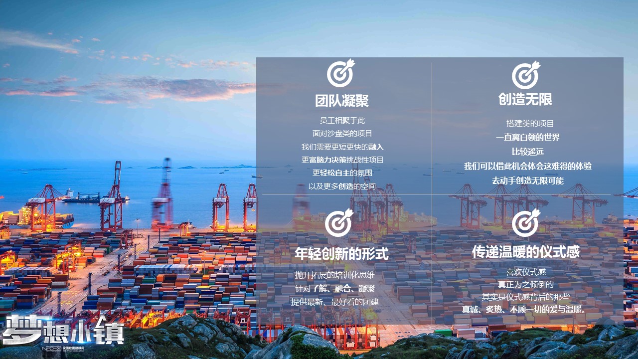 夢(mèng)想小鎮(zhèn)以體驗(yàn)式學(xué)習(xí)的方式,加強(qiáng)彼此間的溝通,通過項(xiàng)目體驗(yàn)及提升,宣導(dǎo)并加強(qiáng)企業(yè)文化,增強(qiáng)團(tuán)隊(duì)凝聚力,提升士氣,感恩與責(zé)任。