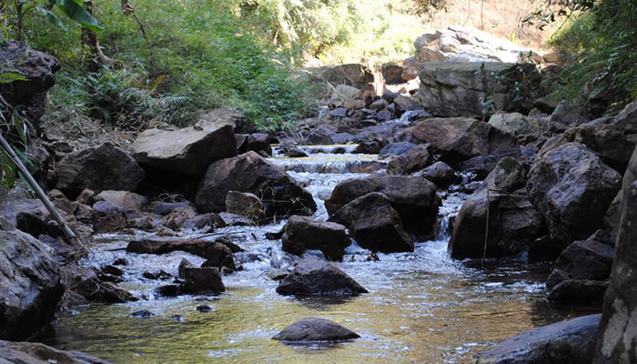 池潭四周青山環(huán)抱,奇石錯落,野花簇?fù)?,與周圍景色渾然一體,是炎炎夏日,幽谷索源,暢游溪頭的理想去處。