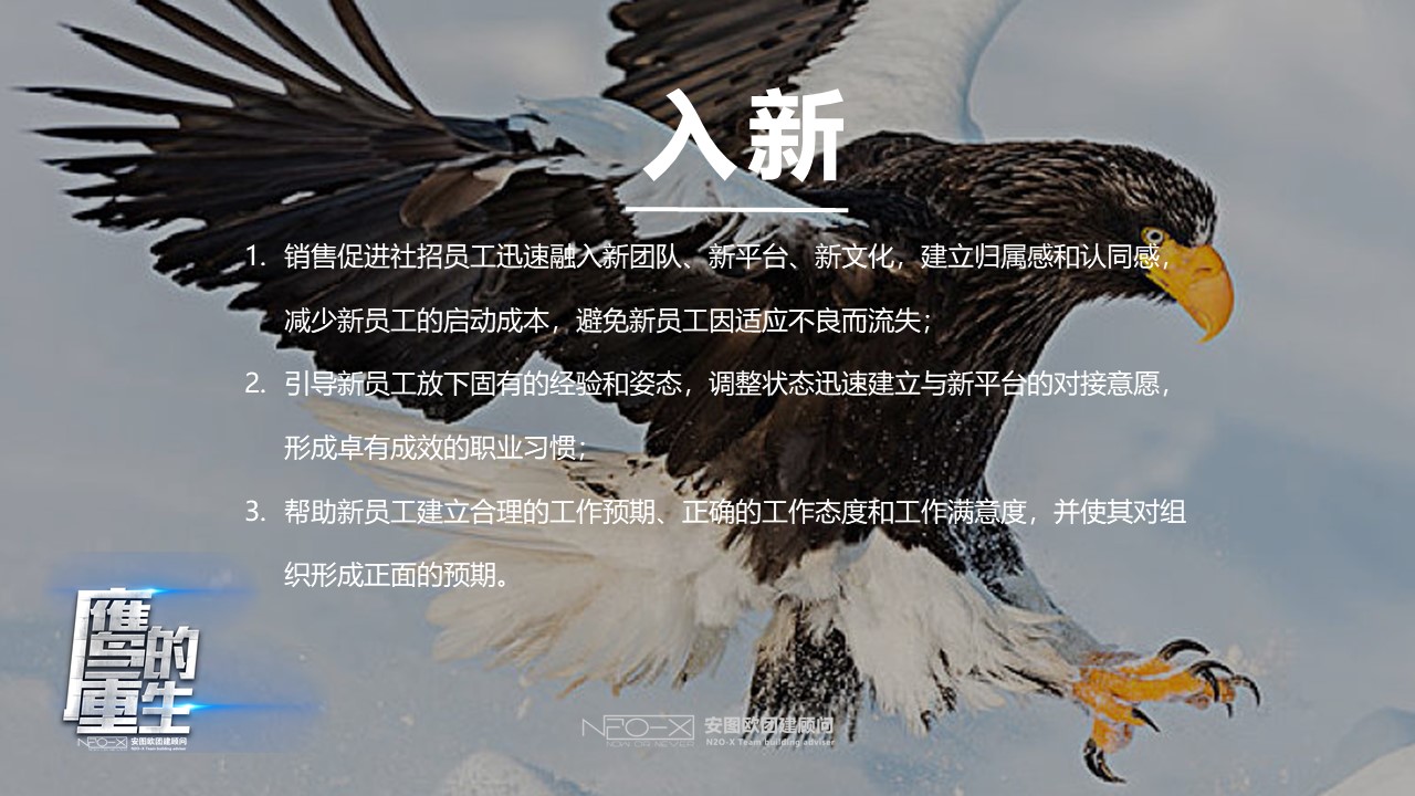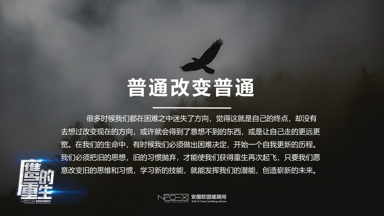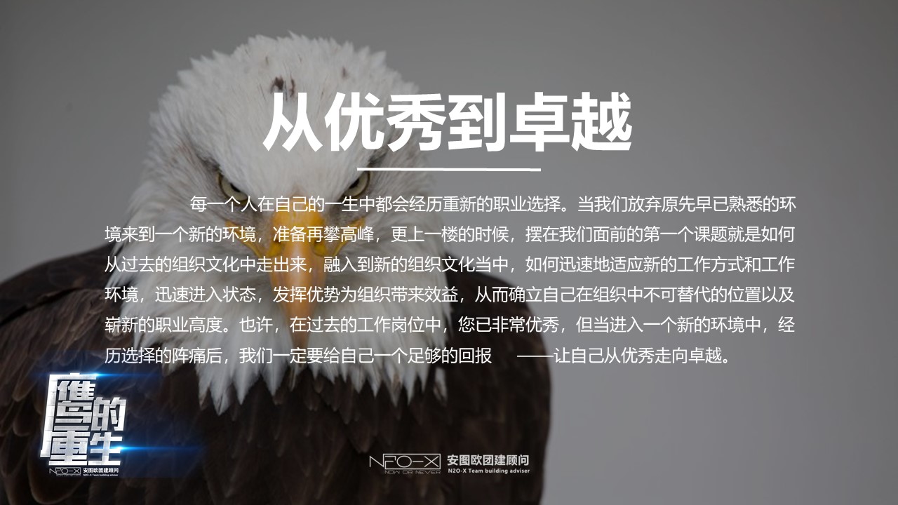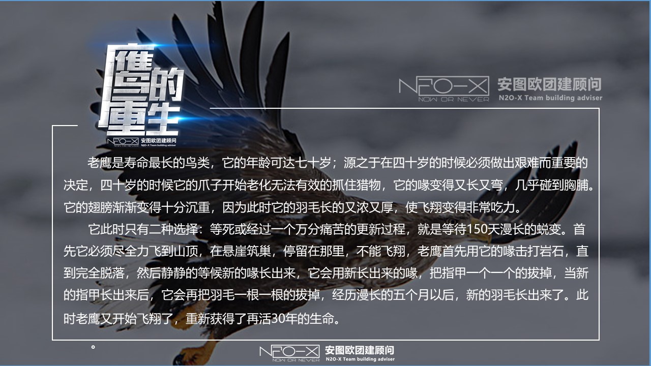 它此時只有二種選擇:等死或經過一個萬分痛苦的更新過程,就是等待150天漫長的蛻變。首先它必須盡全力飛到山頂,在懸崖筑巢,停留在那里,不能飛翔,老鷹首先用它的喙擊打巖石,直到完全脫落,然后靜靜的等候新的喙長出來,它會用新長出來的喙,把指甲一個一個的拔掉,當新的指甲長出來后,它會再把羽毛一根一根的拔掉,經歷漫長的五個月以后,新的羽毛長出來了。此時老鷹又開始飛翔了,重新獲得了再活30年的生命。